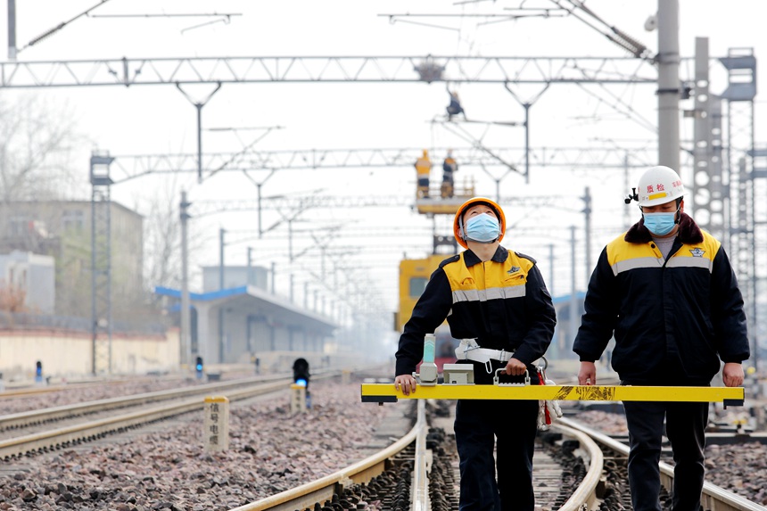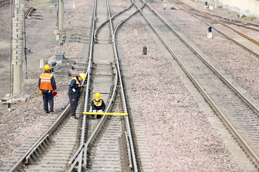 工作人員正在利用水平尺對開封站接觸網(wǎng)線岔水平值進行測量。周曉陽攝