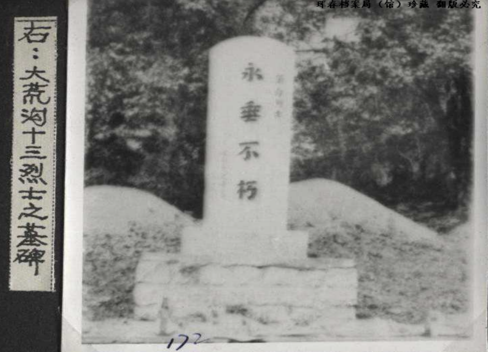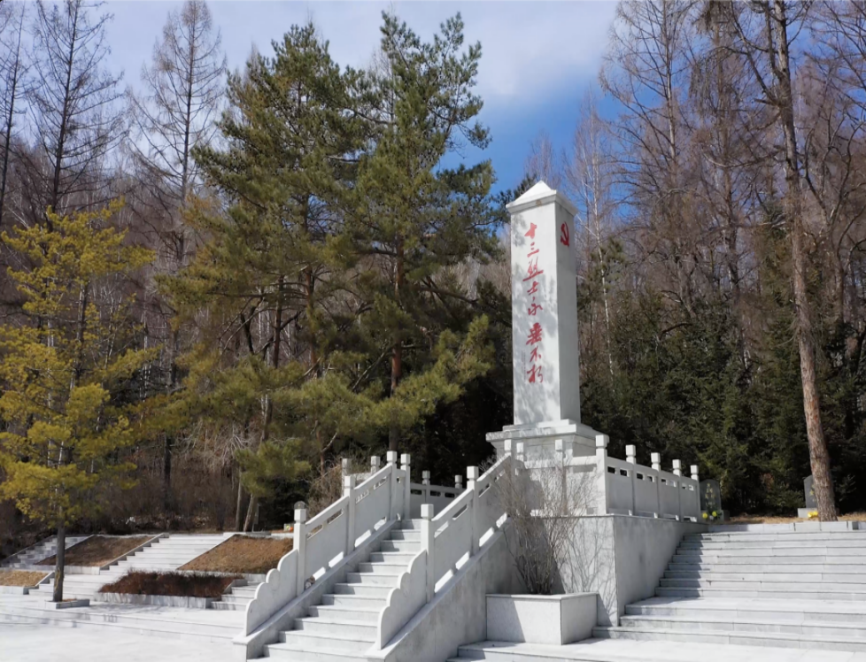 “1938年農(nóng)歷8月17日,當?shù)乜谷沼螕絷犜趨⒓右粓鰬?zhàn)斗后返回密林深處的大荒溝休整。因叛徒告密,日軍夜晚偷襲,13位隊員在戰(zhàn)斗中犧牲。英雄的遺體被就地掩埋、合葬在此。1958年,當?shù)攸h委和政府將烈士遺骸整理出來重新安葬,分別立碑。”