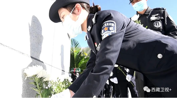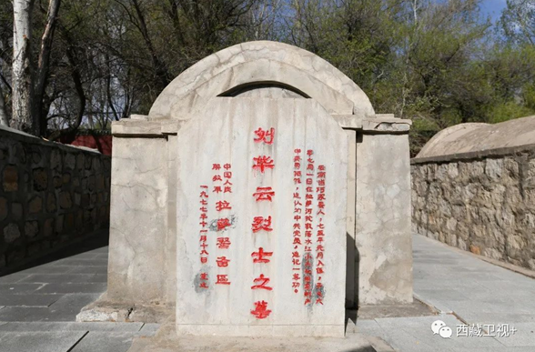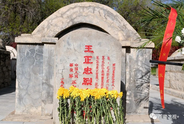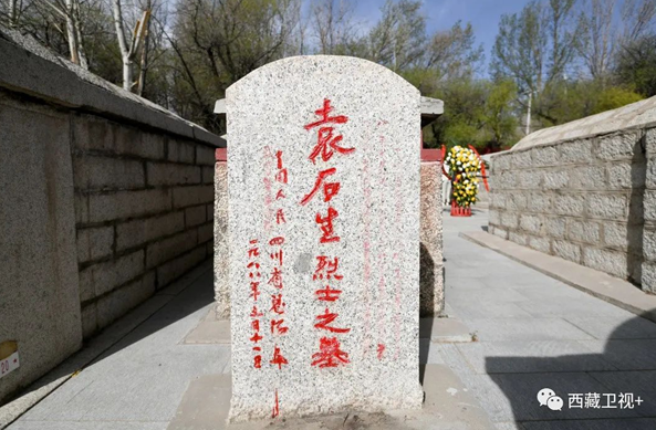 陵園正門上方用漢文和藏文書寫有“拉薩烈士陵園”,兩側(cè)刻有毛澤東的詩詞“為有犧牲多壯志,敢教日月?lián)Q新天”。