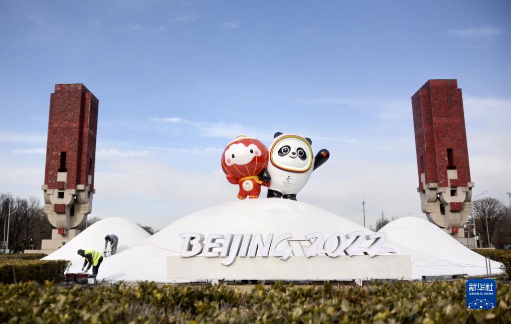 這是2022年1月12日在北京奧林匹克景觀大道拍攝的北京2022年冬奧會和冬殘奧會吉祥物“冰墩墩”“雪容融”。新華社記者 李欣 攝