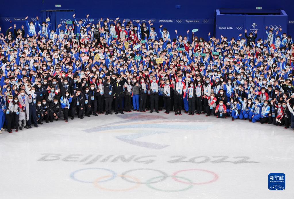 2022年2月20日,工作人員和志愿者在北京首都體育館舉行的北京冬奧會花樣滑冰表演滑后合影留念。新華社記者 王毓國 攝