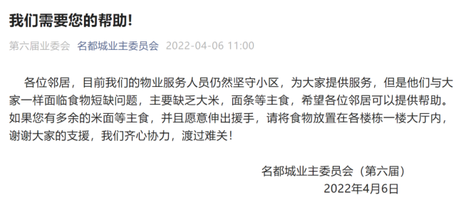 各位鄰居,目前我們的物業(yè)服務(wù)人員仍然堅(jiān)守小區(qū),為大家提供服務(wù),但是他們與大家一樣面臨食物短缺問(wèn)題,主要缺乏大米,面條等主食,希望各位鄰居可以提供幫助。如果您有多余的米面等主食,并且愿意伸出援手,請(qǐng)將食物放置在各樓棟一樓大廳內(nèi),謝謝大家的支援,我們齊心協(xié)力,渡過(guò)難關(guān)!