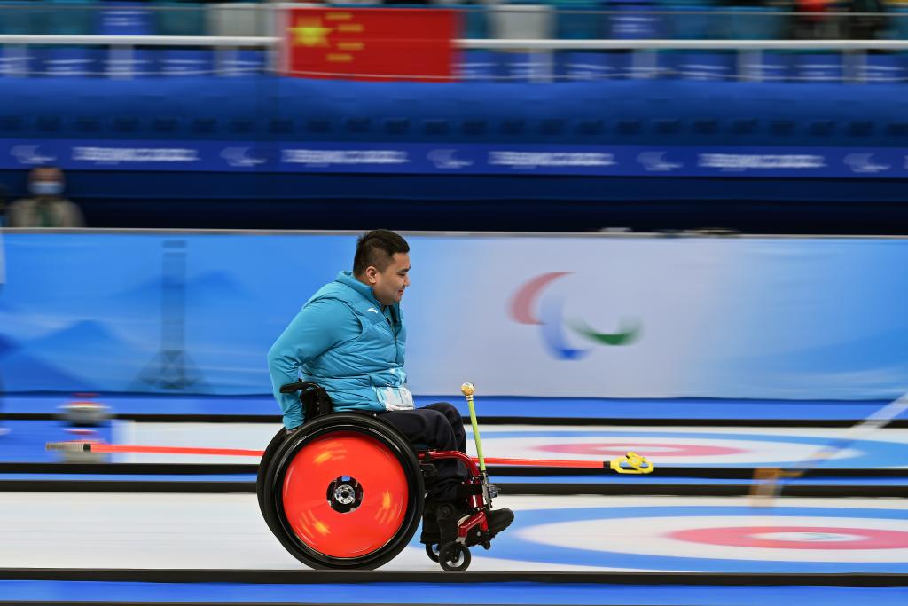 3月12日,北京2022年冬殘奧會輪椅冰壺金牌賽中,中國隊(duì)以8比3戰(zhàn)勝瑞典隊(duì),奪得冠軍,圖為中國隊(duì)選手王海濤在比賽中。新華社記者李尕?cái)z