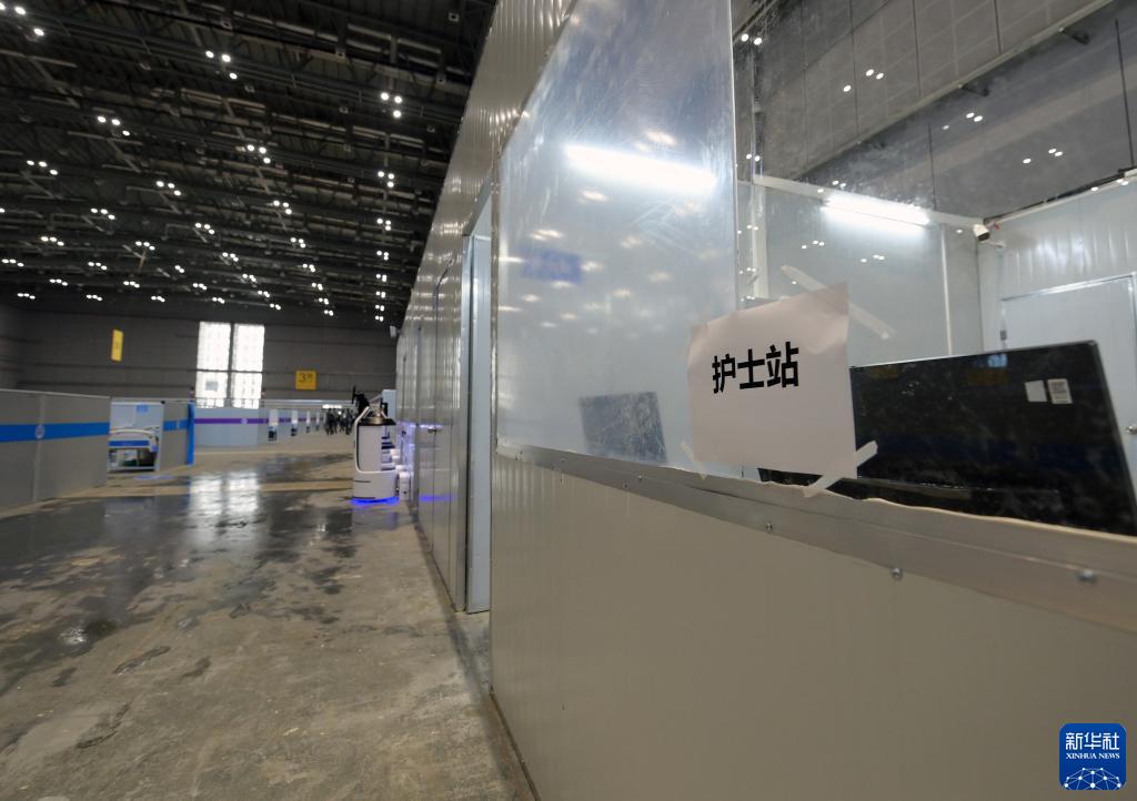 4月9日,完工交付的“四葉草”方艙醫(yī)院3號館內即將投入使用的護士站。新華社記者 李賀 攝