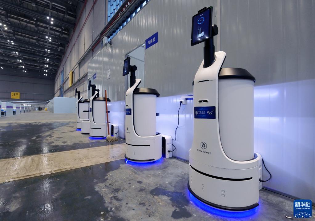 4月9日,在完工交付的“四葉草”方艙醫(yī)院3號館內,云端智能服務機器人已經(jīng)就位,即將為收治在這里的病患提供多種服務。新華社記者 李賀 攝