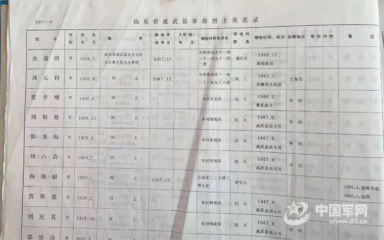 文章中注明“焦像田”烈士的原籍是“成武縣九女榮村”,成武縣退役軍人事務局經(jīng)過摸排,發(fā)現(xiàn)現(xiàn)在的九女集鎮(zhèn)并沒有“榮村”這一地名。是否是解放前的地名?還是解放后行政區(qū)劃更改了?查閱成武縣烈士英名錄、史志和軍事志等資料的同志,翻遍了有關(guān)檔案也沒有見到這個烈士名字。他們與淮海戰(zhàn)役烈士陵園聯(lián)系,進一步了解烈士信息,并通過走訪老兵,在縣有關(guān)媒體轉(zhuǎn)發(fā)尋親信息等方式,開展了社會化尋找。一天下來,沒有任何線索。