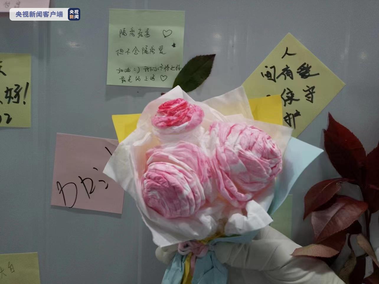 如何讓隔離人員在臨港方艙找到家的溫暖,以最好的心態(tài)共克時(shí)艱?江蘇省援滬醫(yī)療隊(duì)方艙分隊(duì)副領(lǐng)隊(duì)、中大醫(yī)院總領(lǐng)隊(duì)黃英姿副院長(zhǎng)的建議下,統(tǒng)籌布置一面獨(dú)特而暖心的“心愿墻”。艙友們紛紛前來書寫下自己的心愿,還有一位小艙友送來了自制的手工花束。