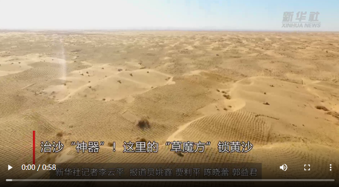 在我國第八大沙漠烏蘭布和沙漠防沙治沙綜合示范區(qū),工人將麥草壓入沙中制作草方格沙障。在連綿起伏的沙丘上,縱橫交錯的草方格猶如排列整齊的“魔方”,將一個個沙丘分割、鎖住。