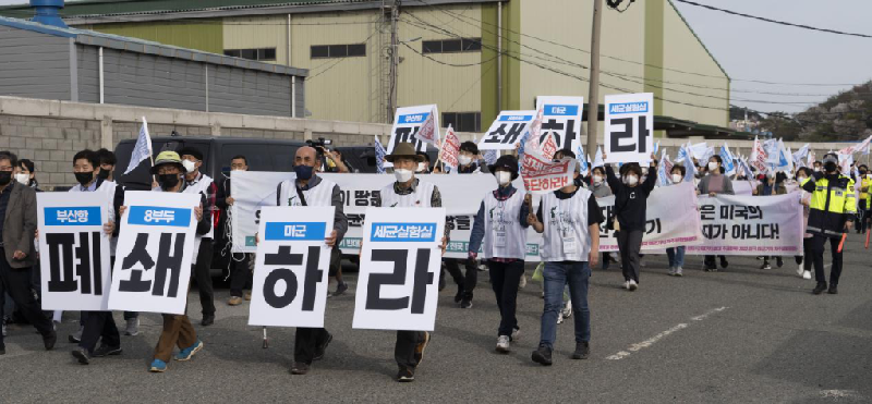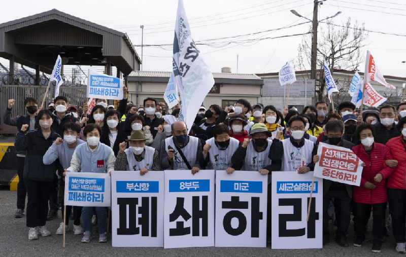 2022年4月5日,韓國民間團(tuán)體在韓國釜山的美軍基地附近游行示威,呼吁停止韓美聯(lián)合軍事演習(xí),要求關(guān)閉釜山港美軍基地內(nèi)的生物實(shí)驗(yàn)設(shè)施。李相浩攝