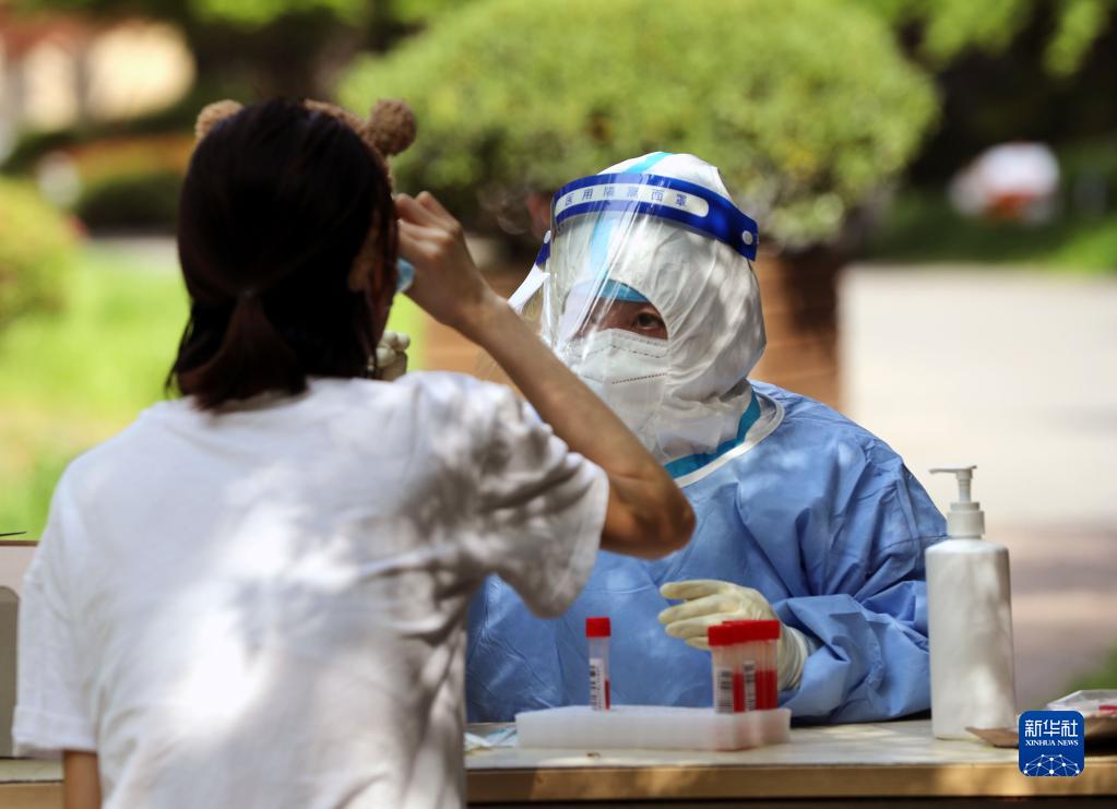 4月12日,在上海松江區(qū)一被列為封控區(qū)的居民小區(qū)內(nèi),醫(yī)務(wù)人員在進(jìn)行核酸檢測(cè)采樣。新華社記者 劉穎 攝