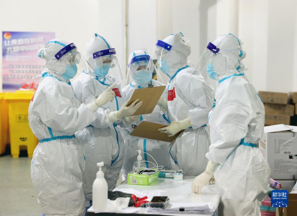 4月11日,世博展覽中心方艙醫(yī)院的醫(yī)務(wù)人員討論工作。目前,在上海世博展覽中心方艙醫(yī)院,福建援滬醫(yī)療隊(duì)的工作正有序開展。新華社發(fā)(劉曉晶 攝)