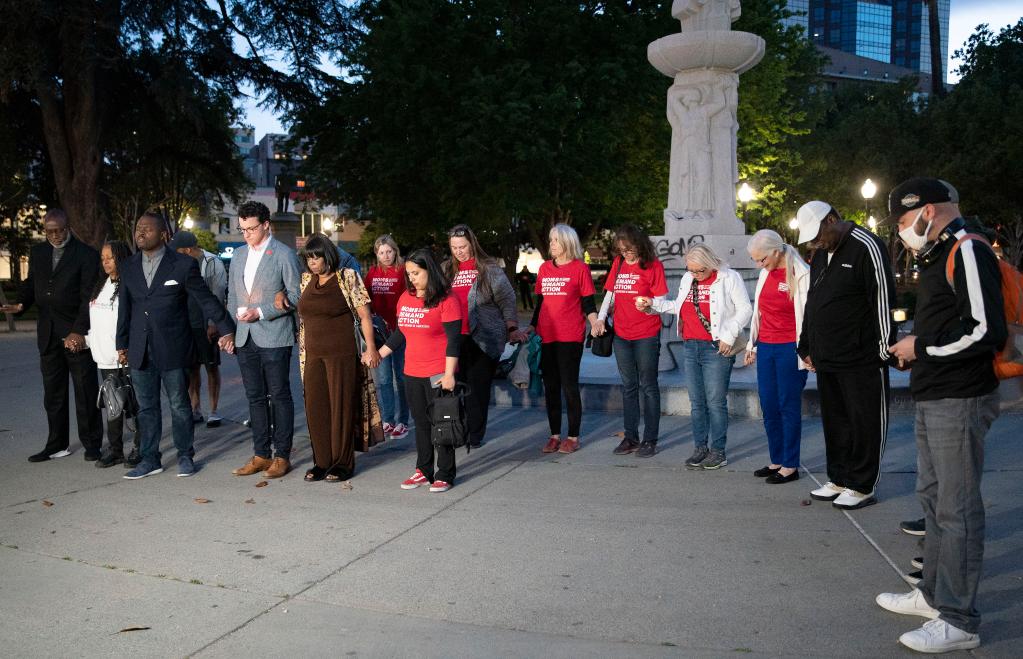 4月3日,人們聚集在美國加利福尼亞州首府薩克拉門托市中心的一處公園里參加守夜活動(dòng),悼念當(dāng)天發(fā)生的槍擊事件遇難者。新華社發(fā)(李建國攝)