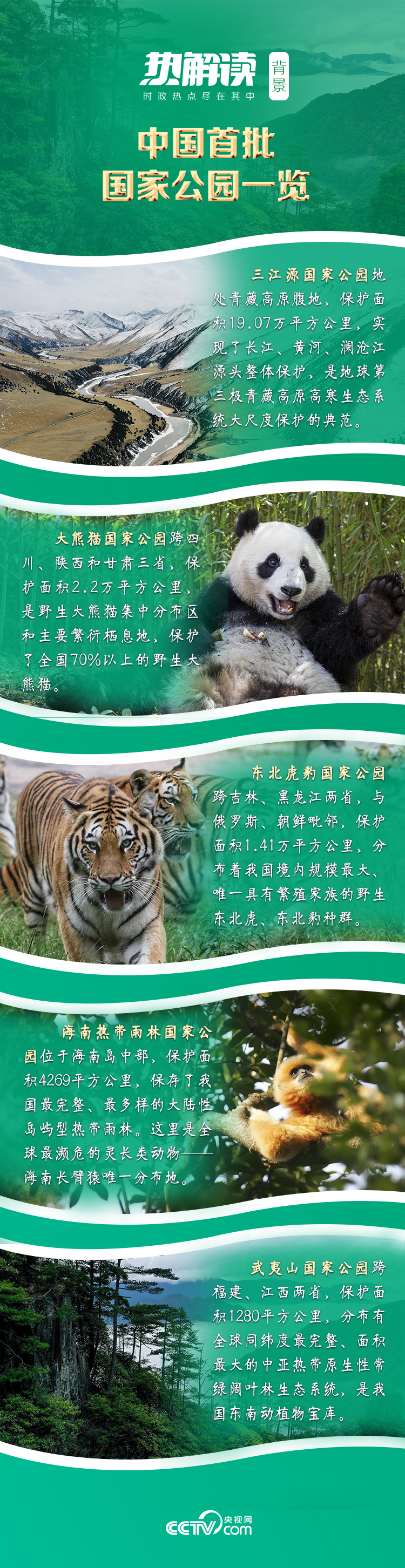 “中華水塔”三江源、竹林幽幽的熊貓樂園、東北原始森林的虎豹天堂、海南島的熱帶雨林、碧水丹霞的武夷山……首批設立的5個國家公園保護面積超過23萬平方公里,涵蓋近30%的陸域國家重點保護野生動植物種類。
