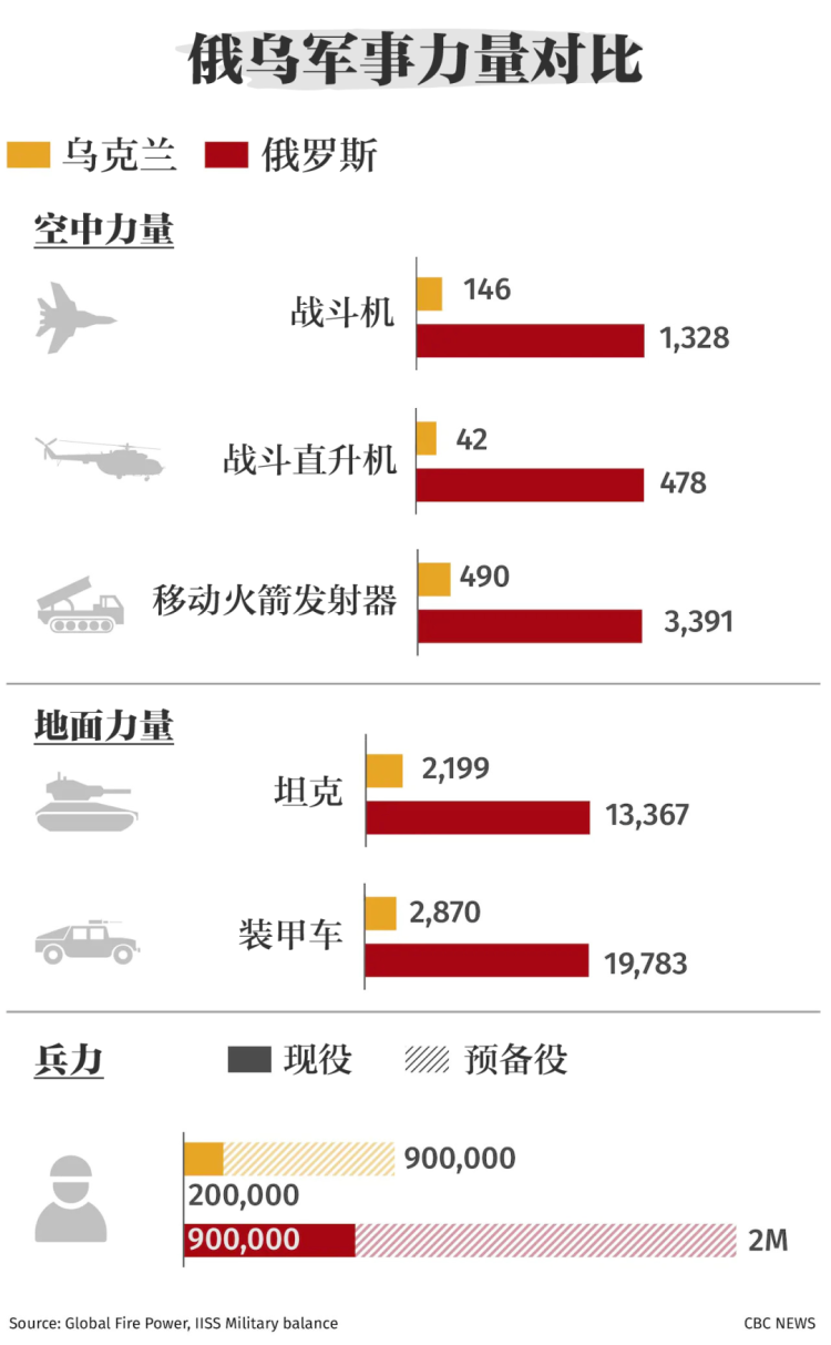 俄烏綜合實力對比懸殊:兩國國土面積相差28倍,烏克蘭人口不到俄羅斯的30%,2021年烏克蘭的GDP只有俄羅斯的12%。兩國軍事力量對比差距很大。