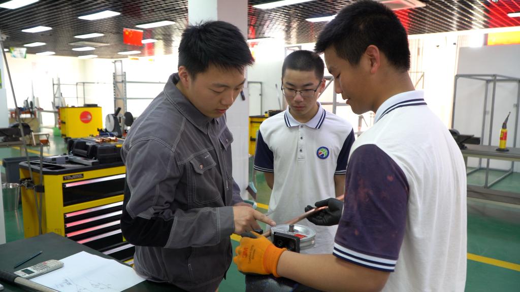 4月12日,在安吉技師學(xué)院的教學(xué)車間里,楊應(yīng)政(左一)正在手把手教授學(xué)生如何做好規(guī)定角度的鋼管煨彎工藝。新華社記者李濤 攝