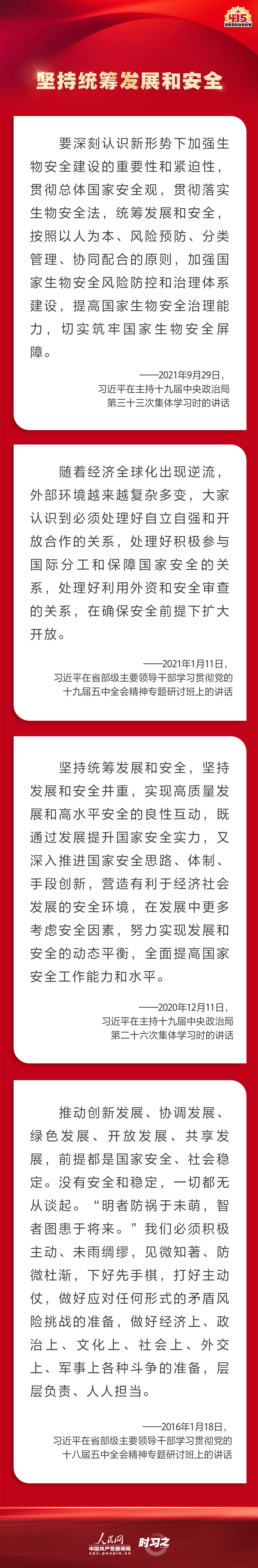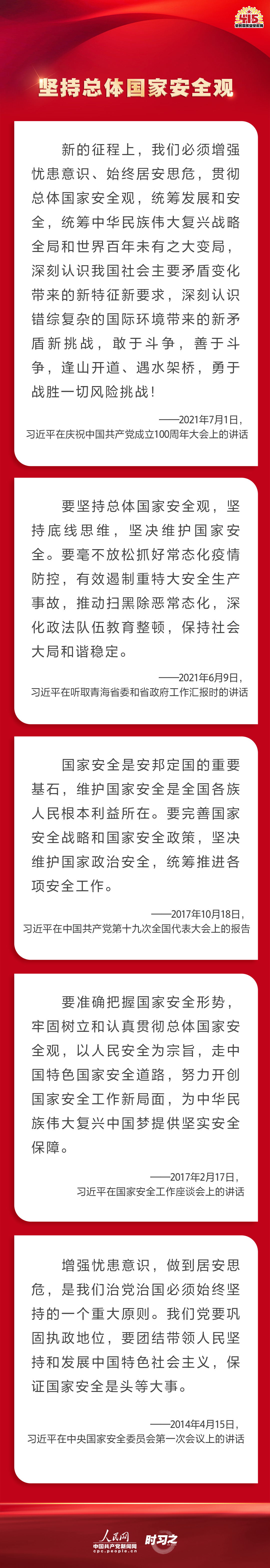 備豫不虞,為國常道。實現(xiàn)中華民族偉大復(fù)興的中國夢,保證人民安居樂業(yè),國家安全是頭等大事。2022年4月15日是第七個全民國家安全教育日,讓我們一起回顧習(xí)近平總書記在不同場合就維護、筑牢國家安全觀發(fā)表的一系列重要論述,增強維護國家安全的責(zé)任感、使命感、緊迫感。