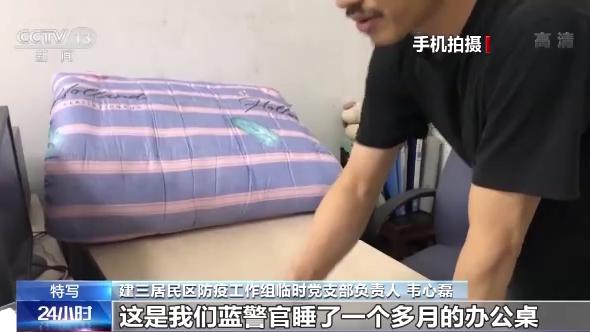 建三居民區(qū)防疫工作組臨時黨支部負(fù)責(zé)人 韋心磊:這是我們藍(lán)警官睡了一個多月的辦公桌,中間還不是很平整。有時候我們送點物資到居民家中,居民會給我們深深鞠一躬,那時候感動還是非常非常大的。