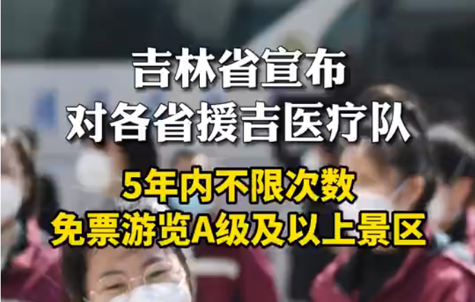【馳援吉林醫(yī)療隊(duì)可免票到吉旅游】吉林省宣布:各省份援吉醫(yī)療隊(duì)隊(duì)員,可攜4位家屬,5年內(nèi)不限次數(shù)免門(mén)票游覽吉林省A級(jí)及以上旅游景區(qū)!