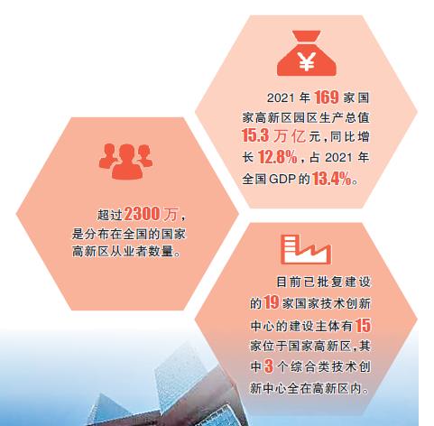 來自科技部火炬中心的數(shù)據(jù)顯示:2021年169家國家高新區(qū)園區(qū)生產總值15.3萬億元,同比增長12.8%,占2021年全國GDP的13.4%。