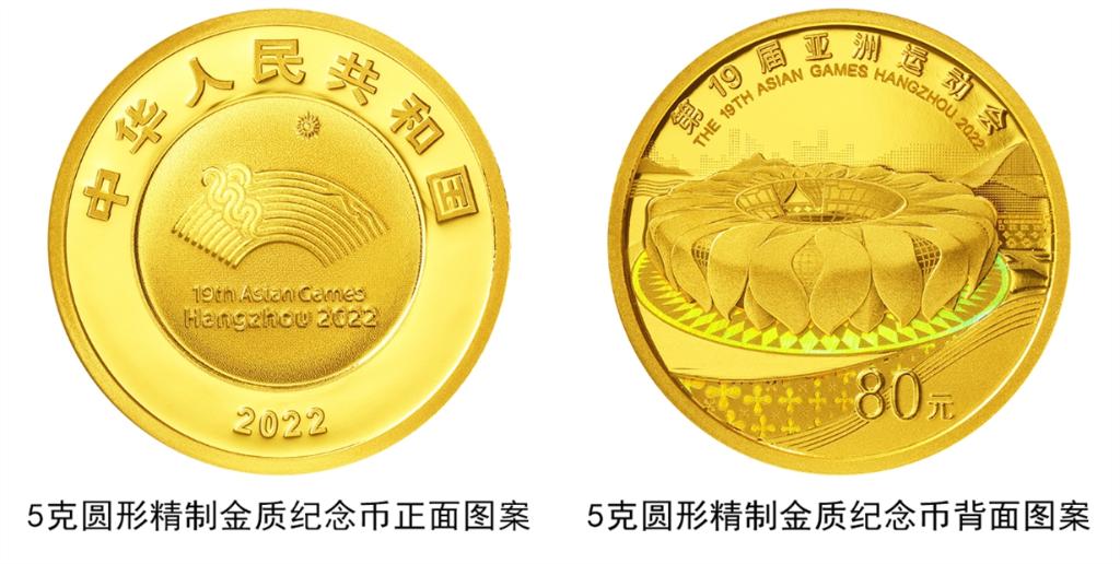 該套金銀紀(jì)念幣正面圖案均為第19屆亞洲運(yùn)動(dòng)會(huì)會(huì)徽,并刊國(guó)名、年號(hào)。5克圓形金質(zhì)紀(jì)念幣背面圖案為杭州奧林匹克體育中心體育場(chǎng),輔以城市建筑、山水、桂花等元素裝飾組合設(shè)計(jì),并刊“第19屆亞洲運(yùn)動(dòng)會(huì)”等字樣。該紀(jì)念幣含純金5克,最大發(fā)行量1萬(wàn)枚。