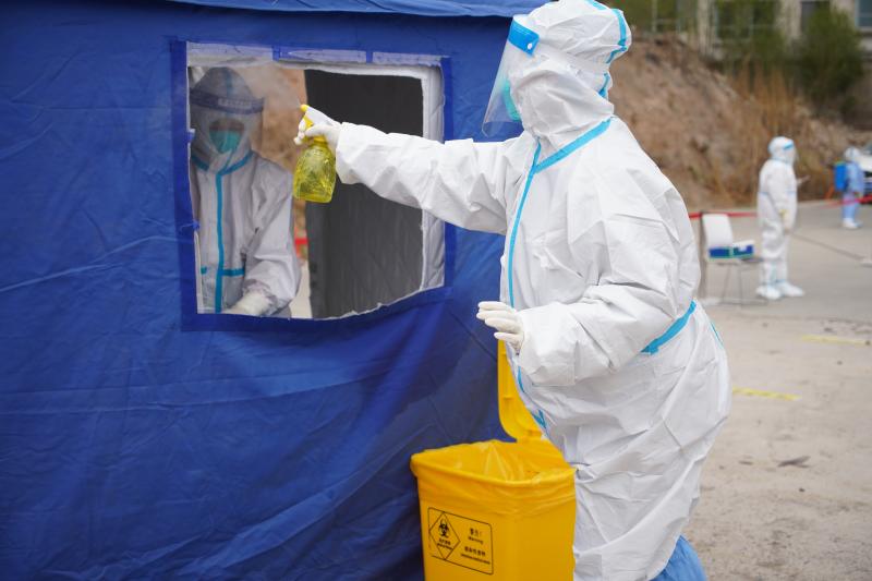 4月15日,在青海省西寧市城西區(qū)一處核酸采集點(diǎn),防疫人員正在做消殺。(新華社記者 張子琪 攝)