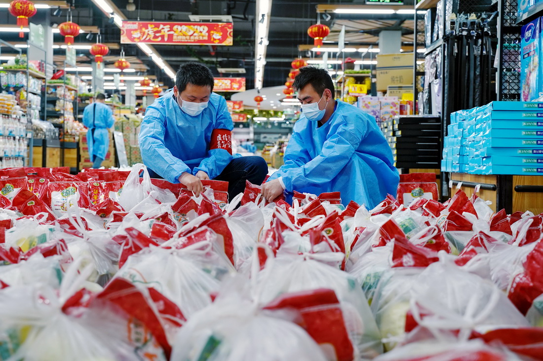 上海市奉賢區(qū)西渡街道社區(qū)發(fā)展綜合服務(wù)中心的工作人員入駐超市,承擔(dān)分揀配貨等工作(4月17日攝)。新華社發(fā)(于薇攝)