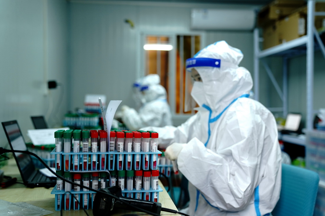 檢測(cè)人員在核子華曦核酸檢測(cè)方艙實(shí)驗(yàn)室的樣本掃碼間忙碌(4月15日攝)。新華社記者 張建松 攝
