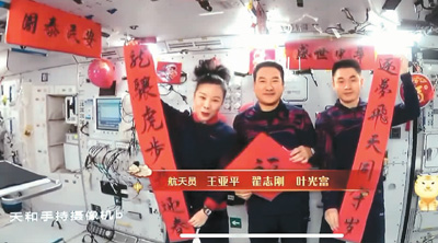 虎年春節(jié)到來之際,“神十三”飛行乘組在中國空間站天和核心艙通過中央電視臺向全球中華兒女拜年。