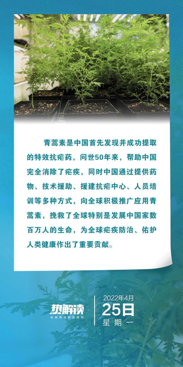 熱解讀4月25日是“世界防治瘧疾日”。習(xí)近平主席向青蒿素問世50周年暨助力共建人類衛(wèi)生健康共同體國際論壇致賀信。