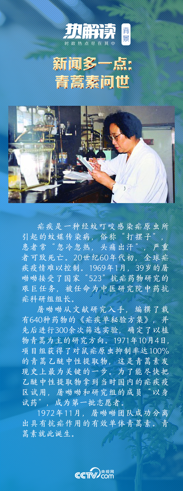 2015年10月,屠呦呦因“從中醫(yī)藥古典文獻(xiàn)中獲取靈感,先驅(qū)性地發(fā)現(xiàn)青蒿素,開創(chuàng)瘧疾治療新方法”,獲得諾貝爾生理學(xué)或醫(yī)學(xué)獎。