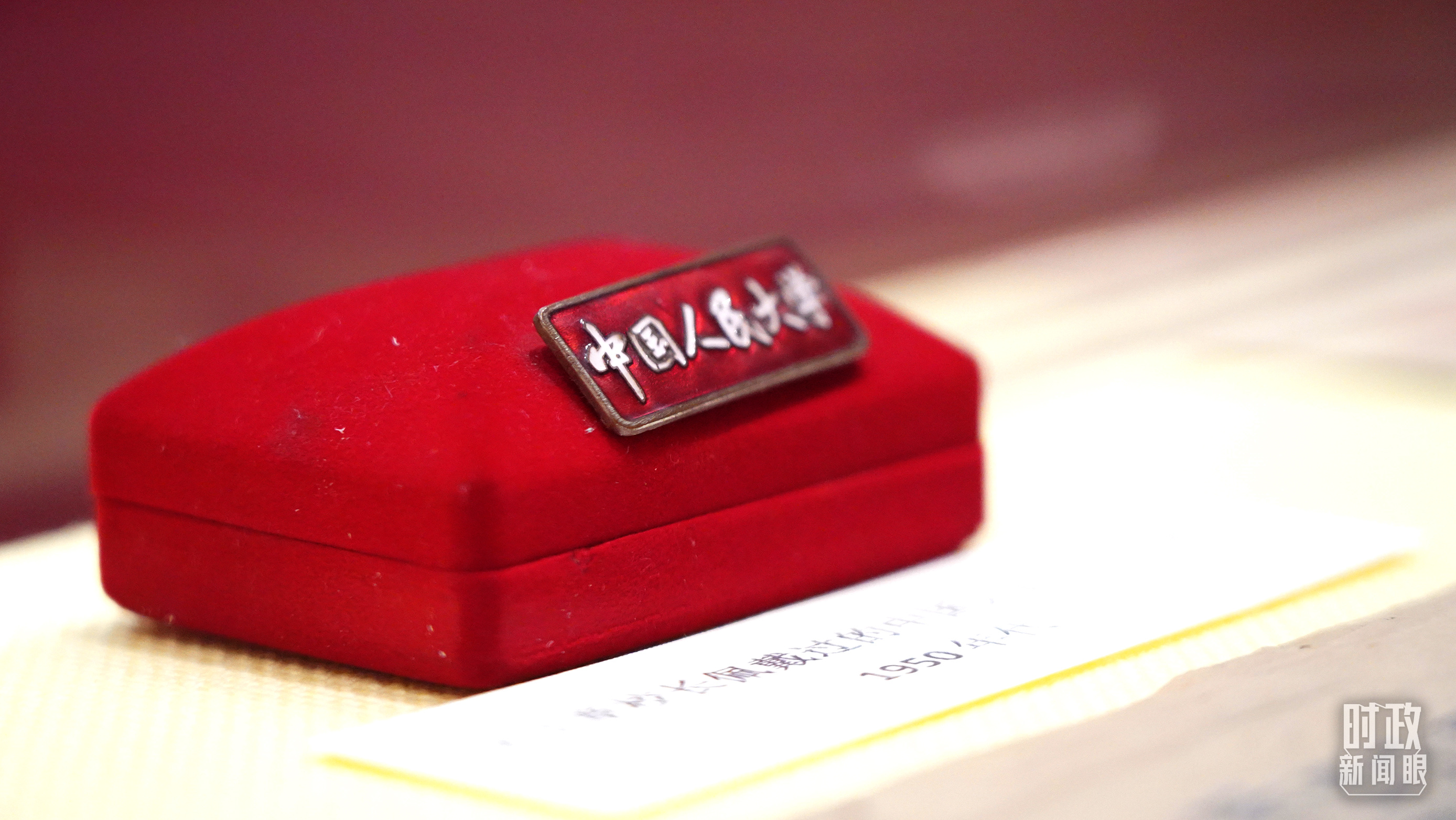 △校史展上,吳玉章校長佩戴過的中國人民大學(xué)校徽。(總臺(tái)央視記者彭漢明拍攝)