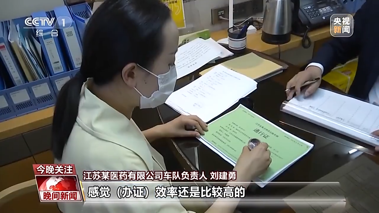 江蘇某醫(yī)藥有限公司車隊(duì)負(fù)責(zé)人 劉建勇:因?yàn)槲覀冞@塊兒主要做的是藥品和防疫物資的配送,所以我們到每個城市的話,都是醫(yī)療機(jī)構(gòu)給我們報的計(jì)劃,所以我們必須要第一時間運(yùn)送到那邊去。感覺(辦證)效率還是比較高的,我們從準(zhǔn)備到現(xiàn)在的話就兩天時間。