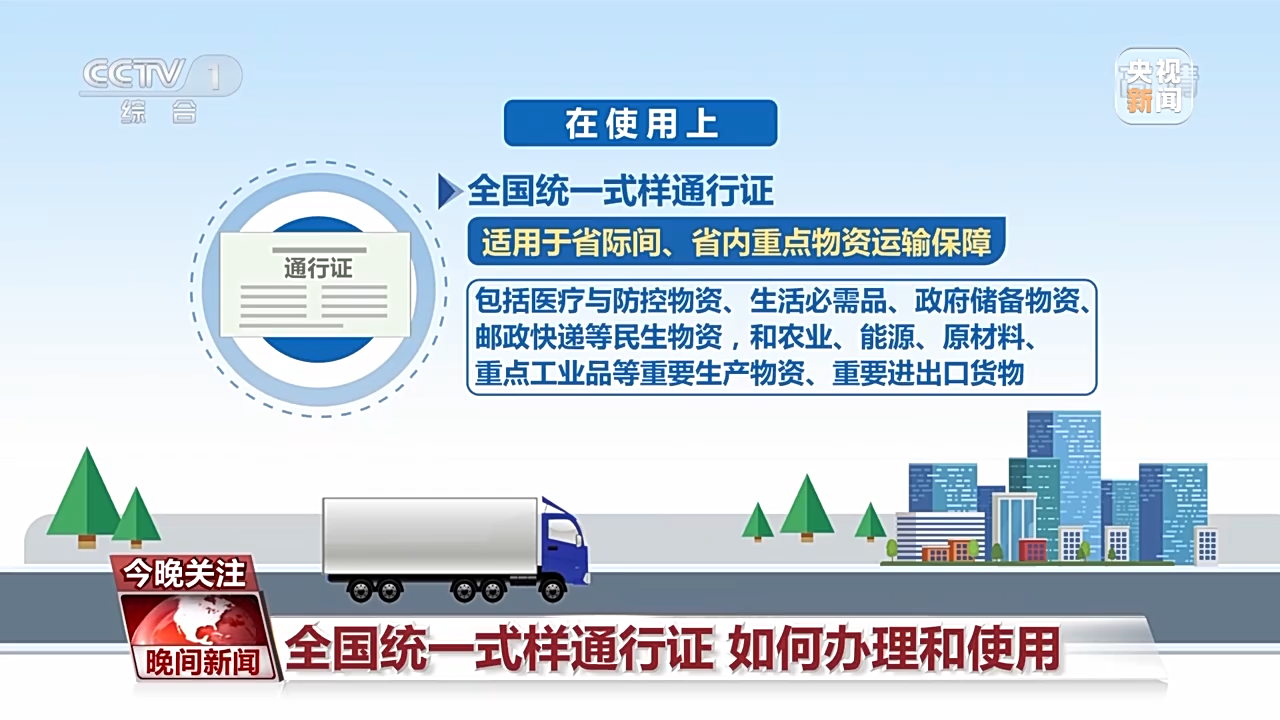 在使用上,全國統(tǒng)一式樣通行證,適用于省際、省內(nèi)重點(diǎn)物資運(yùn)輸保障,包括醫(yī)療與防控物資、生活必需品、政府儲備物資、郵政快遞等民生物資,和農(nóng)業(yè)、能源、原材料、重點(diǎn)工業(yè)品等重要生產(chǎn)物資、重要進(jìn)出口貨物。對于國內(nèi)其他地區(qū)發(fā)放的全國統(tǒng)一式樣通行證的貨運(yùn)車輛,予以認(rèn)可。