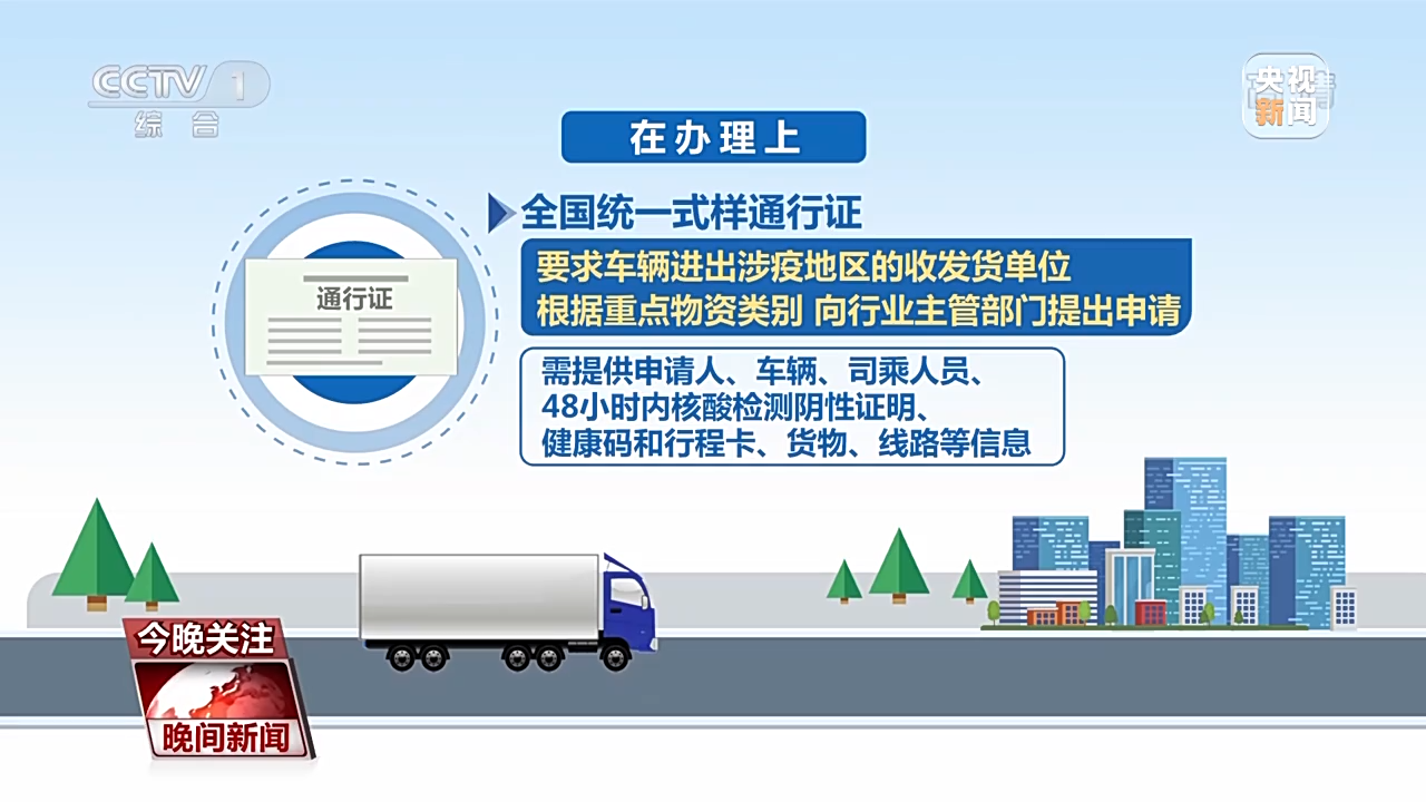 在辦理上,全國統(tǒng)一式樣通行證,要求車輛進(jìn)出涉疫地區(qū)的收發(fā)貨單位根據(jù)重點(diǎn)物資類別,向行業(yè)主管部門提出申請,需提供申請人、車輛、司乘人員、48小時內(nèi)核酸檢測陰性證明、健康碼和行程卡、貨物、線路等信息。