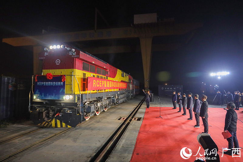 RCEP生效后首趟國(guó)際貨運(yùn)班列從廣西南寧啟程。人民網(wǎng) 吳明江攝