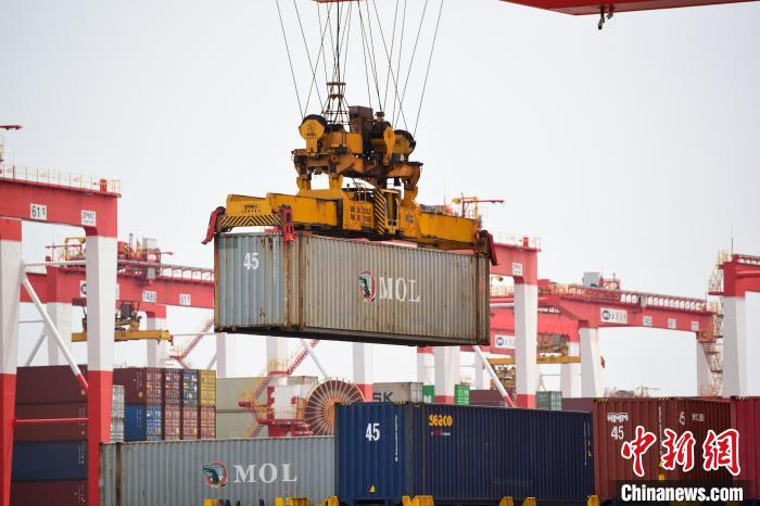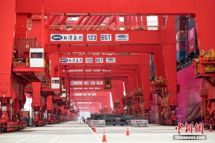 4月27日,上海洋山深水港,岸橋起重機(jī)正在裝卸貨物。中新社記者 田雨昊 攝