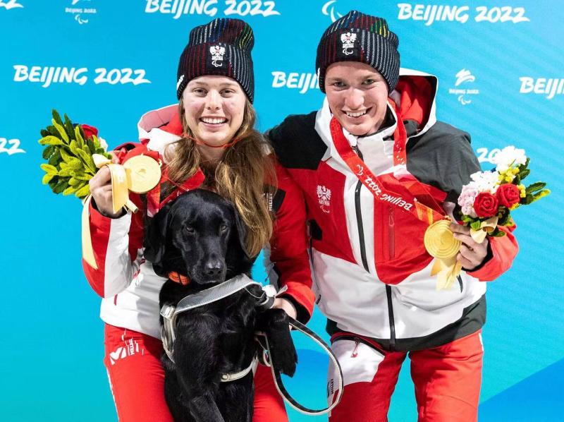 ↑埃德林格(左)與引導(dǎo)員、導(dǎo)盲犬一同站上領(lǐng)獎(jiǎng)臺(tái)