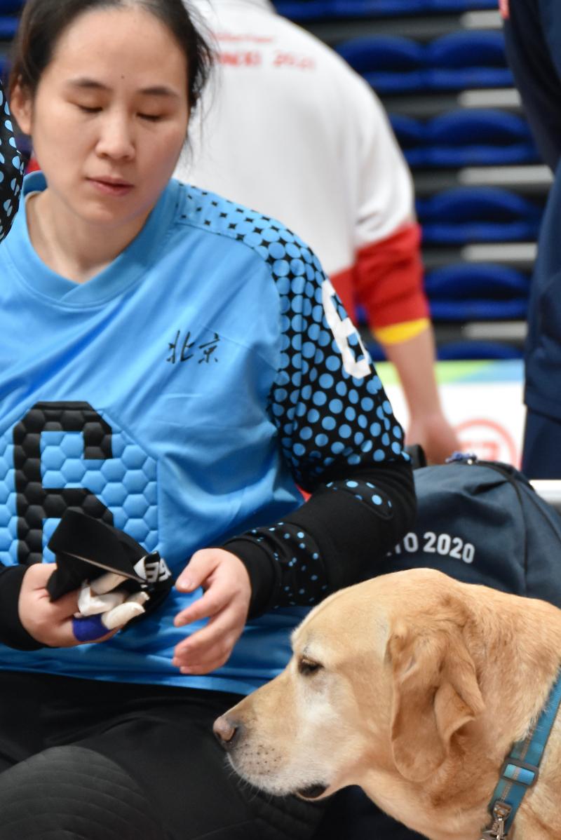 ↑盲人門球名將張魏和她的導(dǎo)盲犬“蒂米”