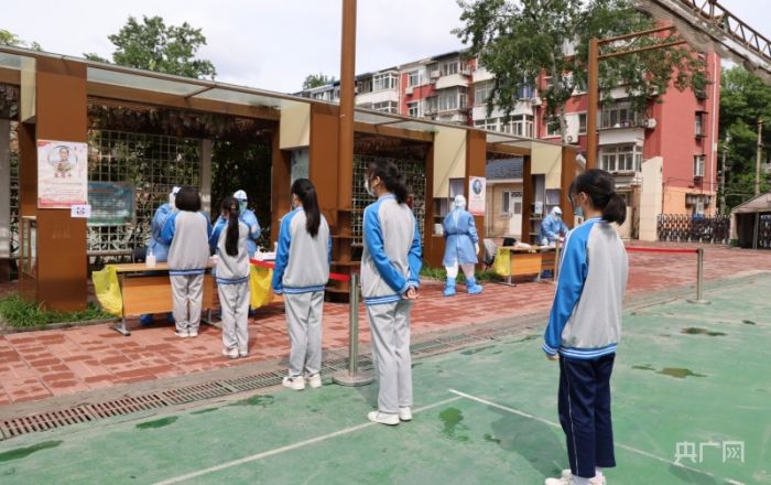 豐臺八中核酸檢測現(xiàn)場,在校同學(xué)排隊有序進(jìn)行檢測(央廣網(wǎng)發(fā) 龔禧攝)