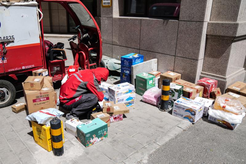 4月26日,在北京市朝陽區(qū)廣和里西路一小區(qū)(防控區(qū)內(nèi))門口,快遞員在整理貨品準備投遞。新華社記者彭子洋攝