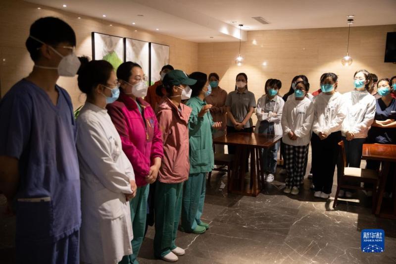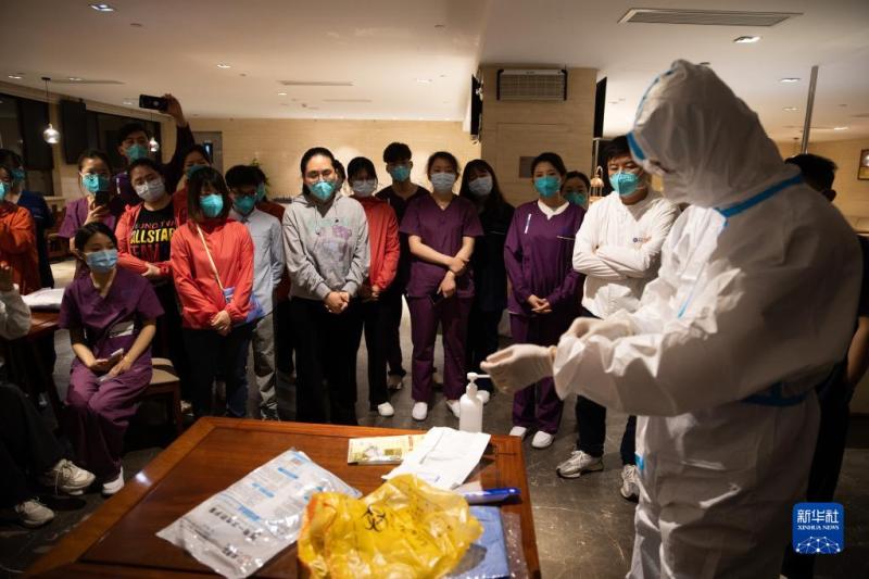 4月28日,在上海浦東北蔡鎮(zhèn)一家酒店,東方醫(yī)院南院醫(yī)護(hù)人員和下午抵達(dá)的杭州口腔醫(yī)院援滬醫(yī)療隊(duì)隊(duì)員交流核酸采樣注意事項(xiàng)。