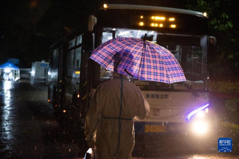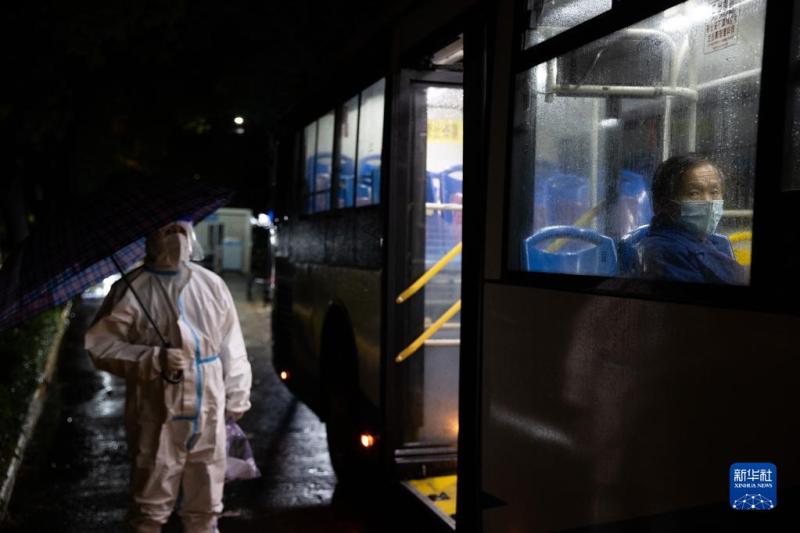 4月28日,在上海浦東北蔡鎮(zhèn)聯(lián)勤村村口,志愿者站在雨中等待轉(zhuǎn)運(yùn)的密接者上車。