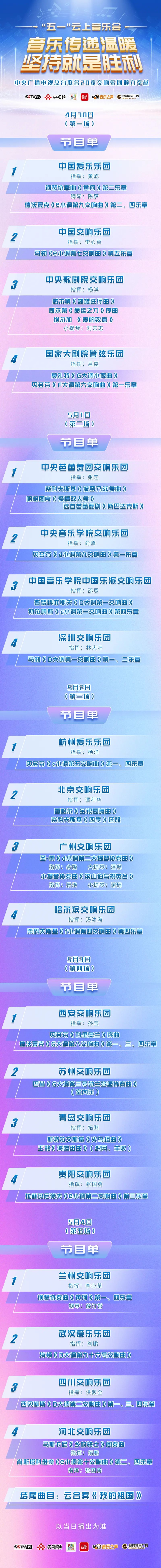 音樂(lè)會(huì)將于4月30日至5月4日,每天20點(diǎn)在央視頻、央視文藝、云聽(tīng)客戶端上線,每天21點(diǎn)40分在央視音樂(lè)頻道播出。5月1日至5月5日晚間,在央廣音樂(lè)之聲、經(jīng)典音樂(lè)廣播頻率播出。