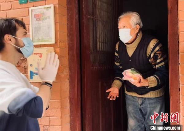 俄羅斯小伙兒matveev(中)在給社區(qū)里的老年人派發(fā)俄羅斯甜點小禮包 受訪者 供圖