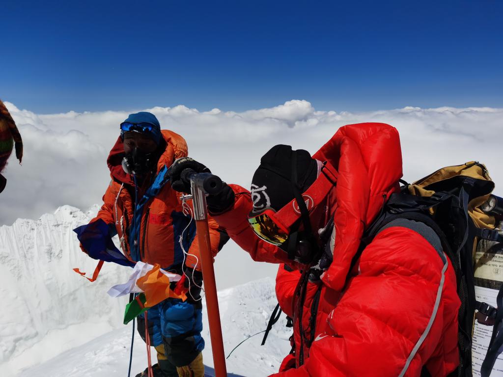 5月4日,科考隊(duì)員登上珠穆朗瑪峰峰頂。新華社特約記者 索朗多吉 攝