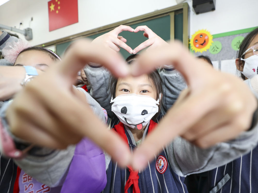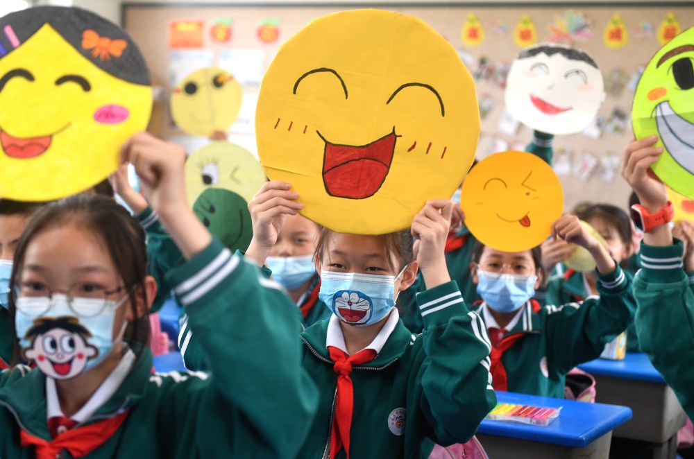 2021年5月8日,石家莊市橋西區(qū)西崗頭小學(xué)學(xué)生手舉笑臉卡做游戲。