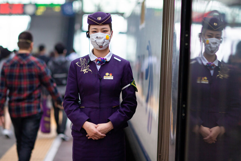 2020年5月8日,在南京火車站站臺上,一名列車員戴著“笑臉口罩”迎接旅客上車。