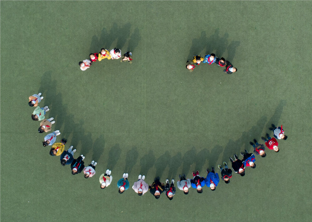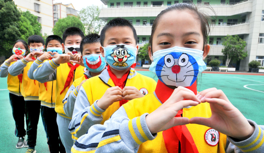 2020年5月8日,安徽省安慶市迎江區(qū)華中路第二小學(xué)在操場上開展手繪“微笑口罩”創(chuàng)意活動,