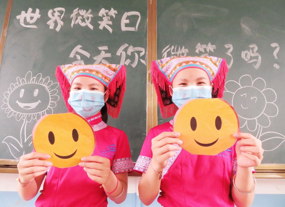 2020年5月8日,在湖南省江永縣蘭溪瑤族鄉(xiāng)學(xué)校六年級一班,一對雙胞胎姐妹在展示自制的笑臉卡。
