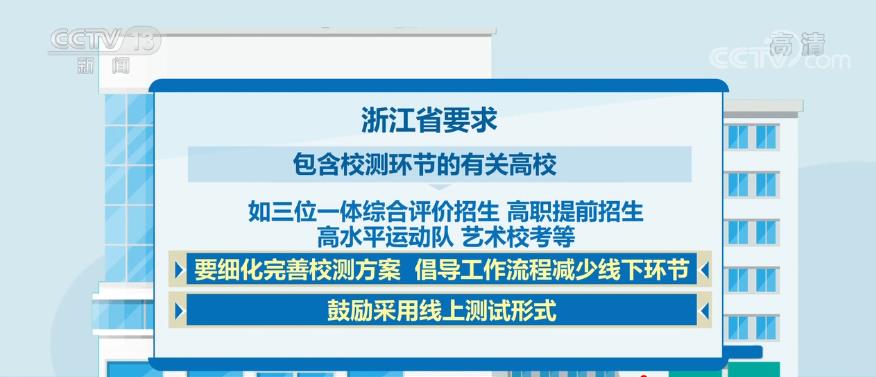 浙江省要求各地各校提前制定突發(fā)疫情應急預案,做到“一類一方案”“一生一方案”。按要求為每個考點配備防疫副主考,設(shè)置具備防護隔離措施的特殊通道和專用隔離考場。包含校測環(huán)節(jié)的有關(guān)高校,如三位一體綜合評價招生、高職提前招生、高水平運動隊、藝術(shù)校考等,要細化完善校測方案,倡導工作流程減少線下環(huán)節(jié),鼓勵采用線上測試形式。